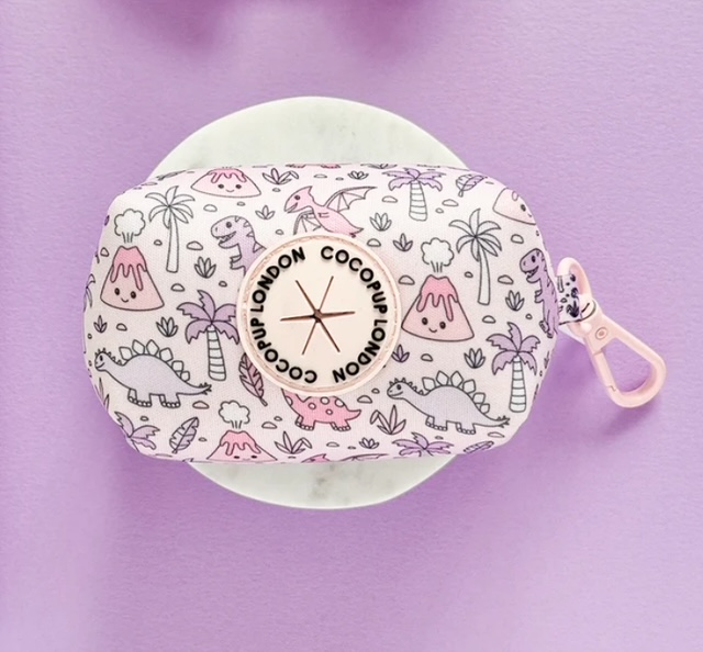 Lilac dinosaur dog poop bag dispenser by COCOPUP